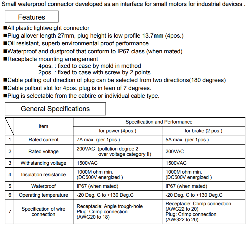 伺服电机专用连接器,IP67的防护等级防水防油可在1米水深中正常使用。采用压线方式,压线稳定、可靠、环保,伺服电机无需再使用引线方式,降低用线成本。引线方式有电机轴同侧出线和异侧出两种。